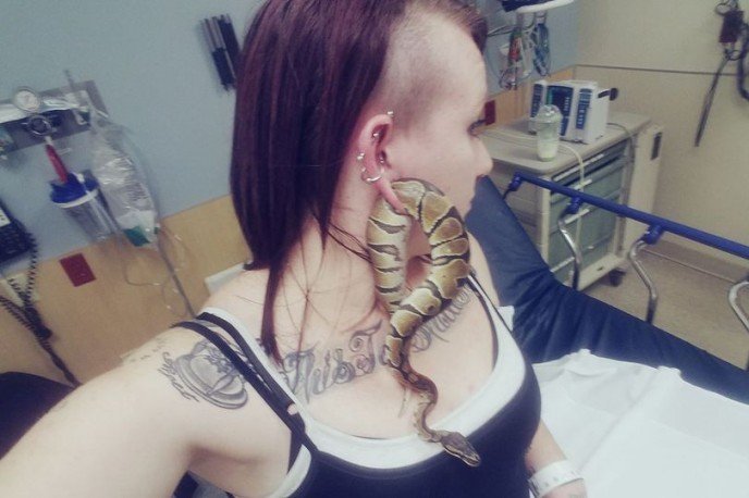 وقالت الفتاة البالغة من العمر 17 عاما والمقيمة في بورتلاند في ولاية اوريغون شمال غرب البلاد انها كانت تلتقط صورة وهي تحمل الثعبان الذي تربيه في منزلها فانزلق في الحلق الذي تضعه في شحمة اذنها وعلق.