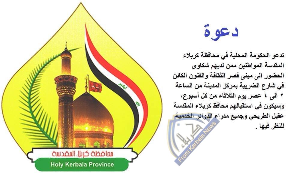 محافظ كربلاء عقيل الطريحي مع المواطن الكربلائي كل يوم ثلاثاء على مبنى قصر الثقافة والفنون وذلك للاستماع إلى شكاويهم