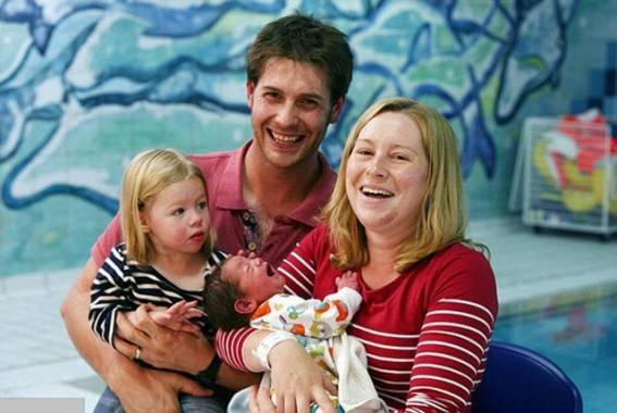 بالصور : أب يعلم ابنه السباحة بعد يوم واحد من ولادته