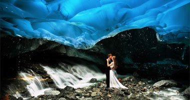 زوجان يقيمان حفل زفافهما فى كهف جليدى