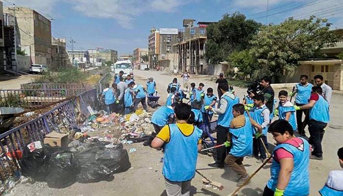 تلاميذ مدرسة ابتدائية في كربلاء يخرجون لتنظيف الشوارع
