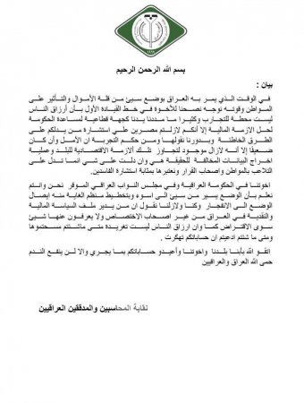 وقالت النقابة في بيان ورد ل وكالة من كربلاء الخبر "في الوقت الذي يمر به العراق بوضع سيئ من قلة الأموال والتأثير على المواطن وقوته نوجه نصحنا للأخوة في خط القيادة الأول بأن أرزاق الناس ليست محطة للتجارب وكثيراً ما مددنا يدنا كجهة قطاعية لمساعدة الحكومة لحل الازمة المالية إلا أنكم لا زلتم مصرين على استشارة من يدلكم على الطرق الخاطئة".