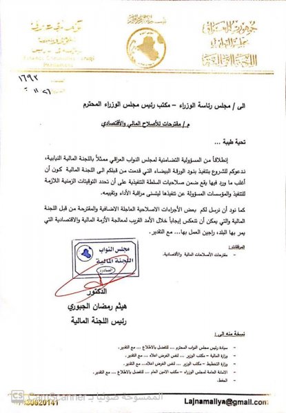 أرسلت اللجنة المالية النيابية إلى مجلس الوزراء كتاباً طالبت فيه بضرورة تنفيذ بنود "الورقة البيضاء" وتحديد التوقيتات الزمية اللازمة للتنفيذ والمؤسسات المسؤولة عن ذلك ليتسنى مراقبة الأداء وتقييمه، وأرفقت بكتابها ورقتها التي سمتها " المقترحات الإجرائية لمعالجة الأزمة المالية" والتي تضمنت إجراءات إصلاحية عاجلة للأزمة المالية التي يمر بها العراق.