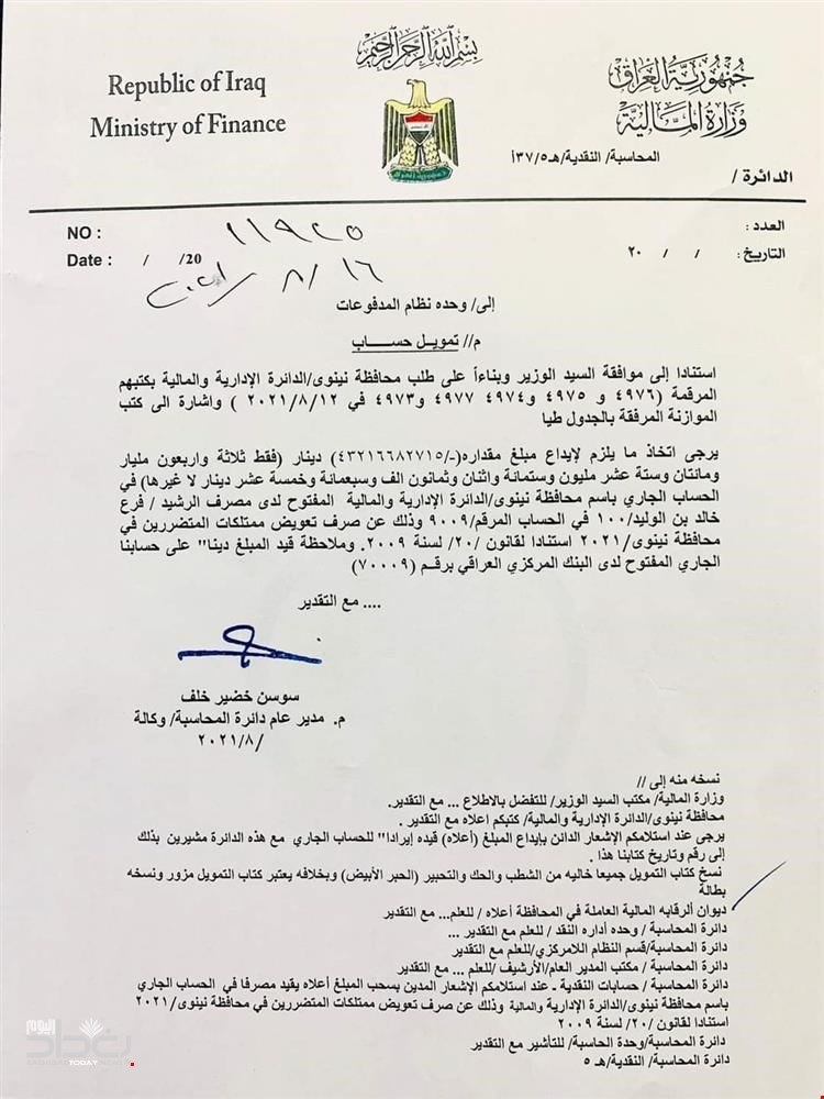 أعلنت وزارة المالية، اليوم الاثنين، عن تحويل 43 مليار دينار في حساب محافظة نينوى لتعويض ممتلكات المتضررين.وذكرت وزارة المالية في وثيقة صادرة عنها : "استنادا الى موافقة وزير المالية وبناءً على طلب محافظة نينوى الدائرة الإدارية والمالية تم توجيه وحدة المدفوعات لصرف 43 مليار دينار بحساب محافظة نينوى بمصرف الرشيد فرع خالد ابن الوليد".وأضافت المالية وفقا للوثيقة ان "الأموال تحول ليتم صرفها لتعويض ممتلكات