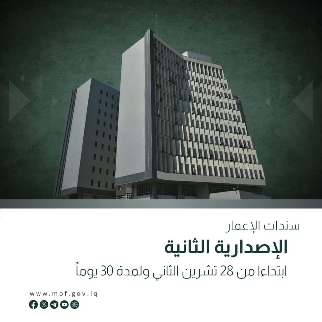 وقال المصرف في بيان تلقته وكالة من كربلاءالخبر: إنه "في خطوة لتعزيز الجانب الاستثماري وتماشياً مع توجيهات وزارة المالية، نعلن عن طرح الإصدارية الثالثة (سندات إعمار) للبيع أمام المواطنين لغاية 30 كانون الثاني  2024، وبنفس الآلية السابقة للإصداريتين الأولى والثانية".
