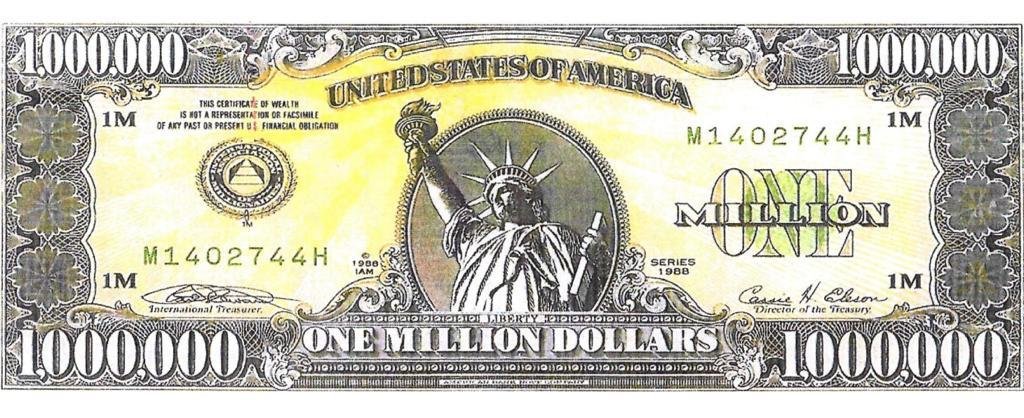 وأوضح :" أن الورقة التذكارية المذكورة غير متداولة في اسواق النقد العالمية ، اذ انها صادرة عن جمعية المليونيرات الامريكية، ولا تعد هذه الورقة نقدية لكونها غير صادرة عن البنك الفيدرالي الامريكي ولا تمثل اي سند مالي، وتستعمل لاغراض الاهداء فقط".