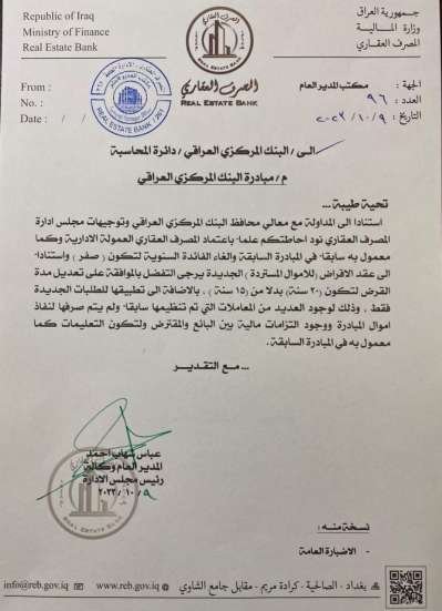 بالوثيقة..المصرف العقاري يقرر إلغاء الفائدة السنوية لمبادرة البنك المركزي