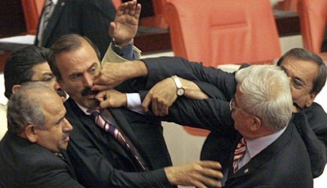 شجار وتراشق بالماء وتبادل الركلات واللكمات في البرلمان التركي