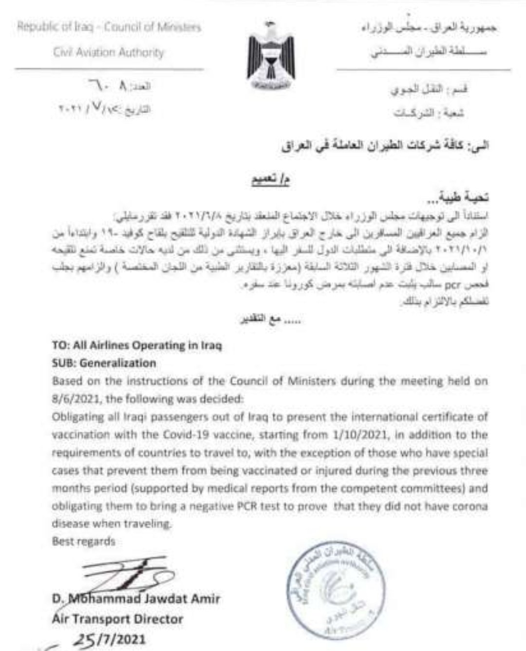 بالوثيقة .. العراق يمنع الاشخاص غير الملقحين من السفر ويستثني هذه الفئات