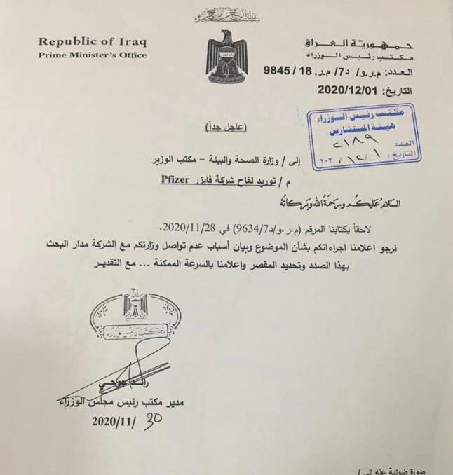 بالوثيقة: مكتب الكاظمي يطلب من وزير الصحة بيان سبب عدم التواصل مع شركة ’’فايزر’’ المنتجة للقاح كورونا