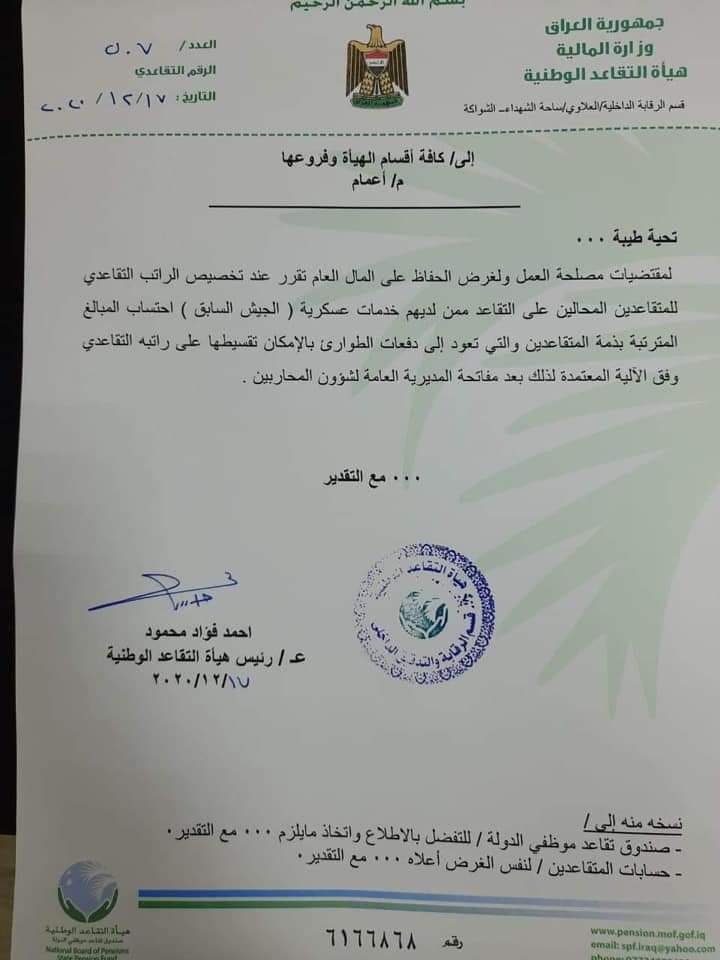 وافقت هيأة التقاعد الوطنية على تقسيط المبلغ الذي بذمة المُتقاعدين من افراد الجيش السابق ليتم احالتهم الى التقاعد وفقاً لإعمام رسمي موضحة تفاصيله في أدناه