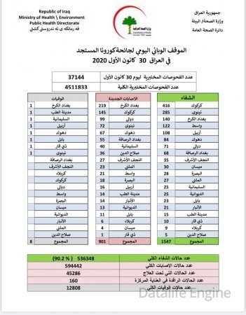 سجلت وزارة الصحة، اليوم الأثنين، 901 اصابة بفايروس كورونا و 1547 حالة شفاء و 8 وفاة في عموم محافظات العراق.