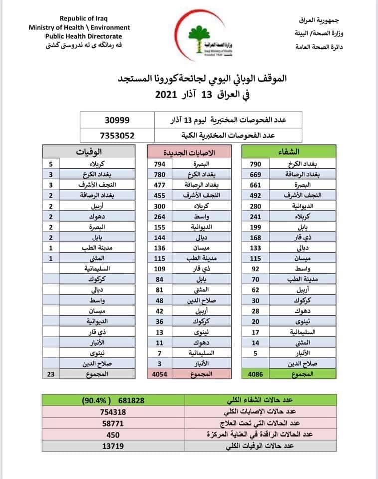وبحسب جدول توضحيي نشرته الوزارة فإنها "سجلت 4054 إصابة جديدة بفيروس كورونا و23 حالة وفاة و4086 حالة شفاء في عموم البلاد خلال يوم واحد".