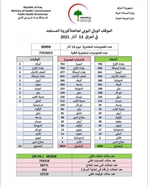 وأضاف الجدول أن "عدد حالات الشفاء الكلي بلغت 681828، والوفيات الكلي 13719، فيما بلغ عدد الإصابات الكلي 754318".