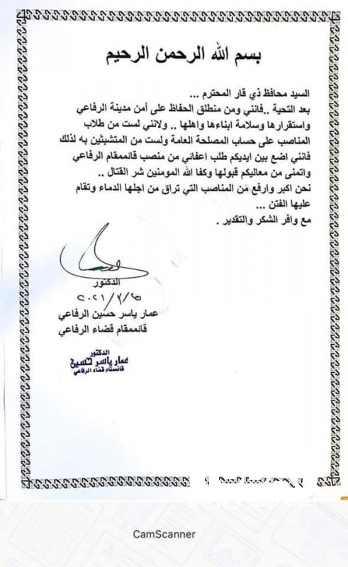 أعلن قائممقام قضاء الرفاعي في محافظة ذي قار، الخميس، تقديم استقالته من منصبه.
