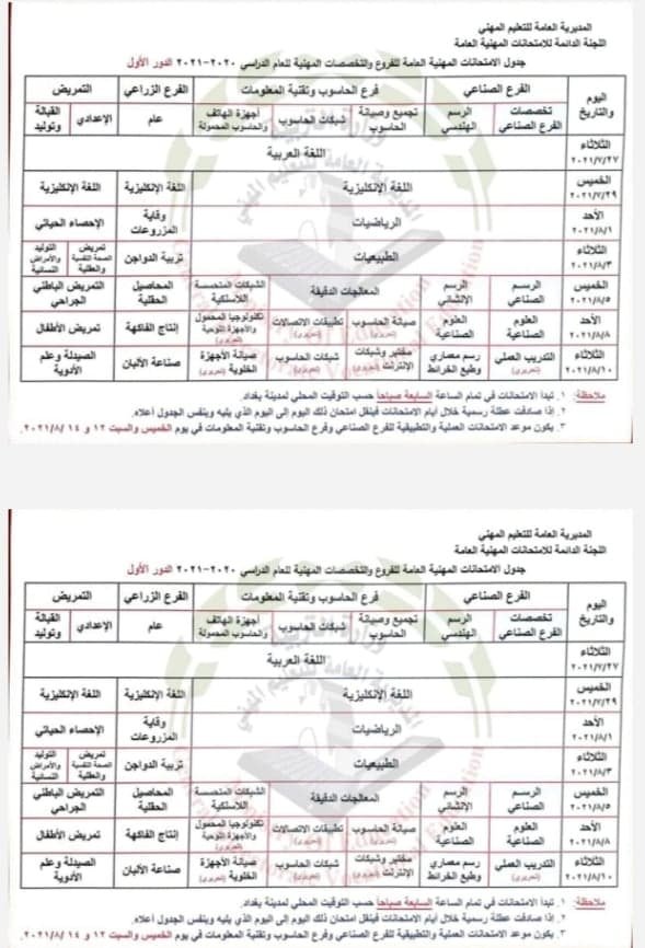 وقالت الوزارة في بيان له، إن "الامتحانات ستنطلق يوم الثلاثاء الموافق 27 تموز لعام 2021 وتستمر لغاية الـ10 من شهر آب المقبل . وأضافت أن "الامتحانات تبدأ في تمام الساعة السابعة صباحاً حسب التوقيت المحلي لمدينة بغداد ، اما في حال وجود عطلة رسمية خلال أيام الامتحانات فينتقل امتحان ذلك اليوم الى اليوم الذي يليه وبنفس الجدول، على ان يكون موعد الامتحانات العملية والتطبيقية للفرع الصناعي وفرع الحاسوب وتقنية المعلومات في يوم الخميس والسبت 12 و 14 / 8 /2021".