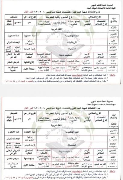 اعلنت وزارة التربية، اليوم الخميس، جدول الامتحانات المهنية الوزارية للفروع والتخصصات المهنية للعام الدراسي 2020 – 2021 "الدور الأول".