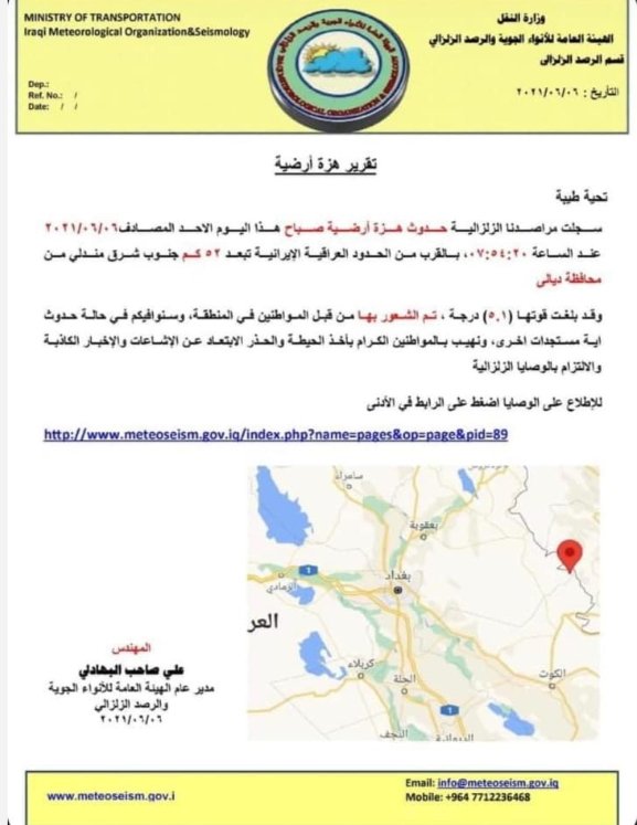 اعلنت وزارة النقل، اليوم الاحد، عن تسجيل مراصدها الزلزالية في الهيأة العامة للانواء الجوية والرصد الزلزالي حدوث هزة في محافظة ديالى.