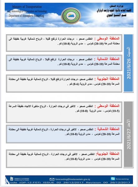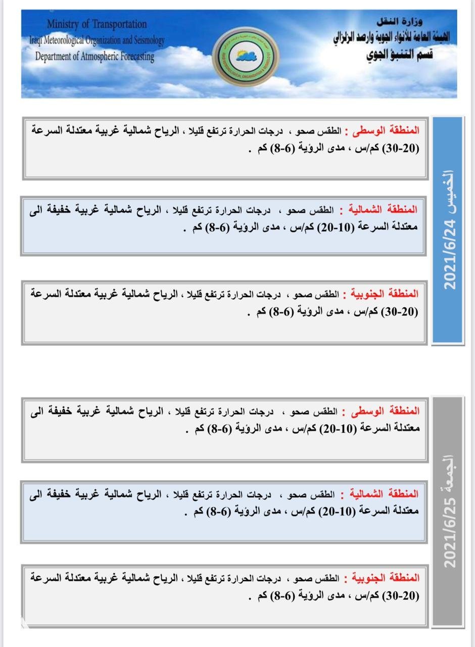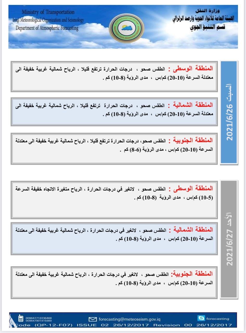 أعلنت الهيأة العامة للأنواء الجوية، اليوم الأربعاء، عن حالة الطقس في البلاد للأيام المقبلة، فيما توقعت أن تصل درجة الحرارة في ميسان يوم غد إلى 49 مئوية.