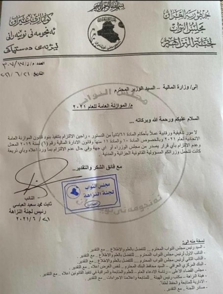 خاطبت لجنة النزاهة النيابية، وزارة المالية، مطالبة إياها بالتقيد بتنفيذ بنود قانون الموازنة العامة الاتحادية 2021 بالاخص نصوص المادتين 10-11 ، وقانون الادارة المالية رقم 6 لسنة 2019 .