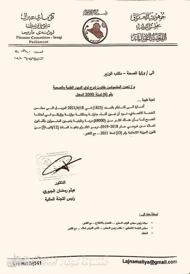 أرسلتاللجنة المالية النيابية، كتاباً رسمياً الى وزارة الصحة تبين فيه انها اعدت بالموازنة العامة الاتحادية اكثر من 68 الف درجة وظيفية وليس 65 الف. وطالب رئيس اللجنة هيثم الجبوري، من وزارة الصحة "الالتزام بالموازنة وما ورد فيها".