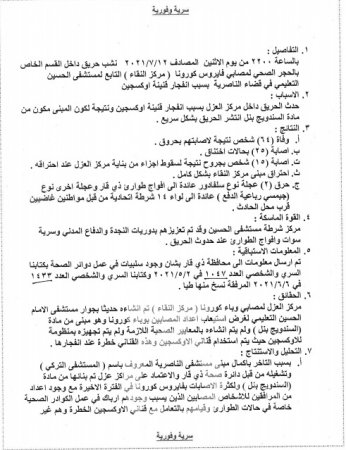 حصل  مصدر صحفي ، على نسخة من التقرير المفصل لحادثة حريق مستشفى الحسين التعليمي، والذي أظهر تضاربا مع الإحصائية التي أعلنتها وزارة الصحة اليوم.