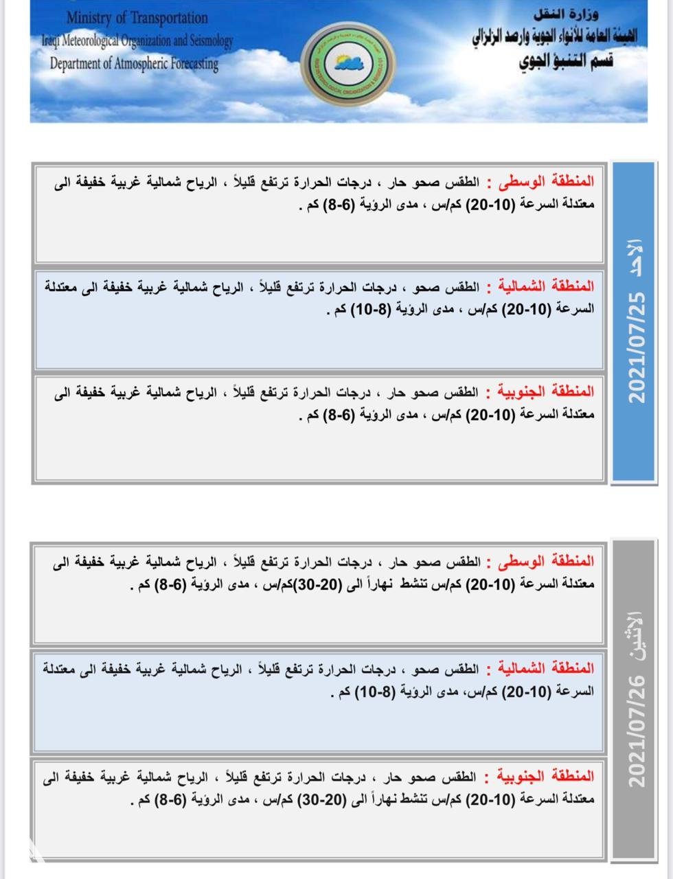 وأشارت الهيأة الى أن "طقس يومي الثلاثاء والاربعاء المقبلين سيكون صحواً حارا جدا ودرجات الحرارة مقاربة لليوم السابق، فيما تكون الرياح شمالية غربية خفيفة الى معتدلة السرعة (10-20) كم/س، وتنشط نهارا في الاقسام الشرقية منها الى (20-30)كم /س، ومدى الرؤية (6-8) كم".