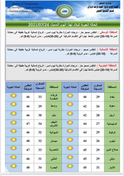 وقالت الهيأة في بيان لها ، إن "الطقس ليوم السبت في المناطق الوسطى والجنوبية والشمالية سيكون صحواً حارا، ودرجات الحرارة مقاربة ليوم امس، فيما ستكون الرياح شمالية غربية خفيفة معتدلة السرعة (10-20) كم/س وتنشط نهارا في الاقسام الشرقية الى (20-30) كم س، ومدى الرؤية (6-8) كم".
