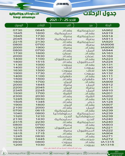 أعلنت الخطوط الجوية العراقية، اليوم السبت،مواعيد رحلاتها ليوم غد الأحد.وبحسب الجدول أدناه فإن عدد الرحلات بلغ 41 رحلة، توزعت بين داخلية وخارجية، إذ بلغ عدد الرحلات الداخلية 18 رحلة، والخارجية 23 رحلة.