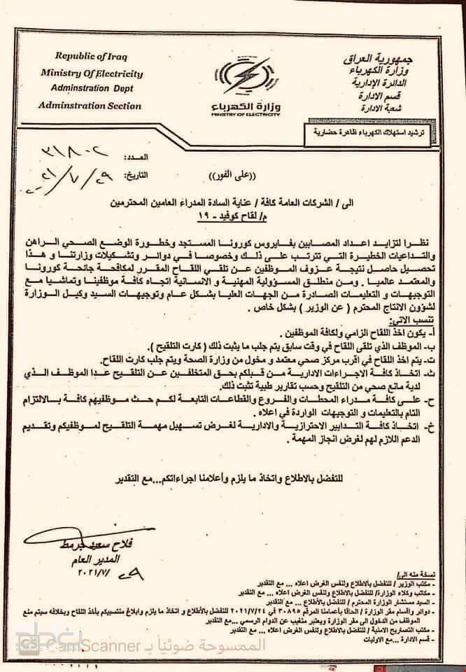 وأوضحت الوثيقة انه "يتوجب على الموظف الذي تلقى اللقاح في وقت سابق جلب مايثبت ذلك،، فيما يتم أخذ اللقاح للموظفين ممن لم يتم تلقيحهم في أقرب مركز صحي، واتخاذ كافة الإجراءات الإدارية بحق الموظفين المتخلفين عن التلقيح ممن ليس لديهم مانع صحي وحسب التقارير الطبية".وأشارت الى أنه يتوجب "على كافة مدراء المحطات والفروع والإدارات والقطاعات التابعة لهم حث موظفيهم بالإلتزام التام بالتعليمات، واتخاذ كافة التدابير الاحترازية الإدارية لغرض تسهيل مهمة التلقيح وتقديم الدعم اللازم لهم لغرض انجاز المهمة".![]()