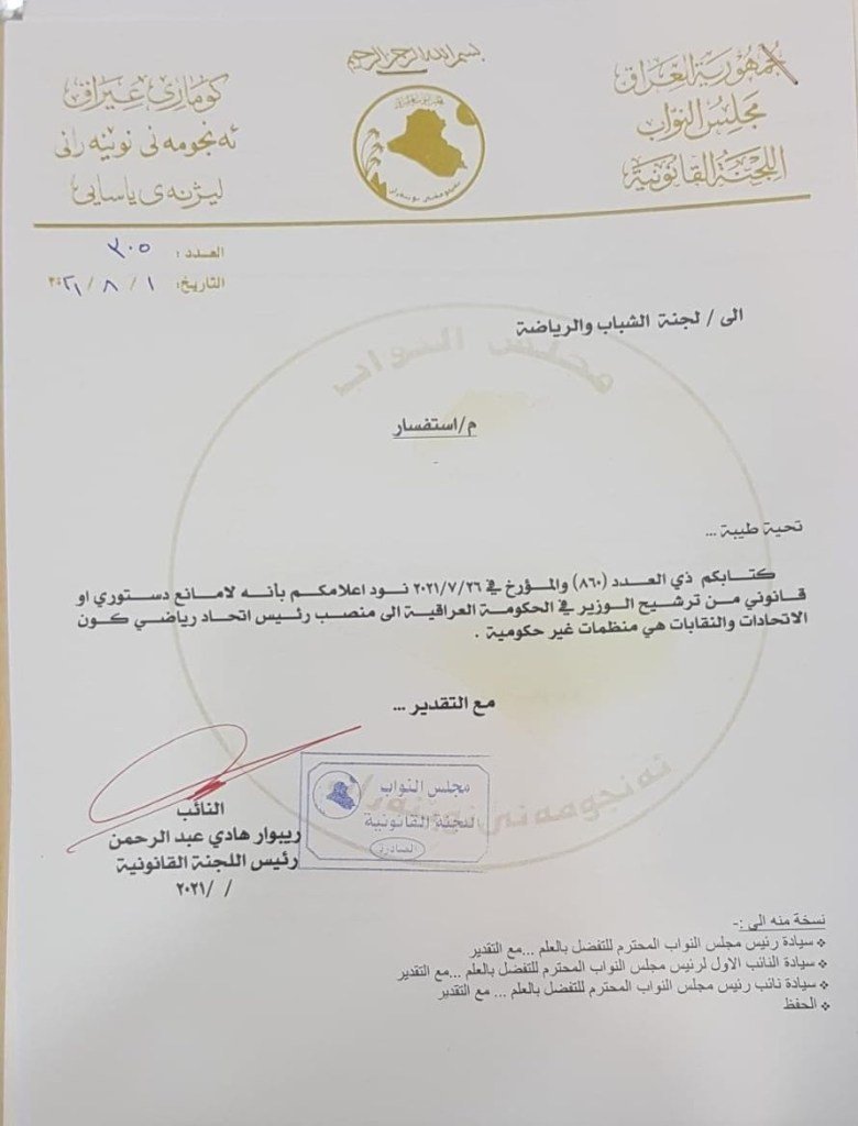 أكدت اللجنة القانونية النيابية اليوم الأحد، عدم وجود أي مانع دستوري أو قانوني من ترشيح وزير الشباب والرياضة عدنان درجال لمنصب رئاسة اتحاد الكرة بوصف أن الاتحادات والنقابات هي منظمات غير حكومية.