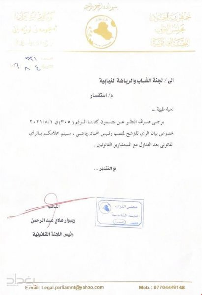 القانونية النيابية تتراجع عن موقفها حول ترشيح درجال لرئاسة اتحاد الكرة (وثيقة)