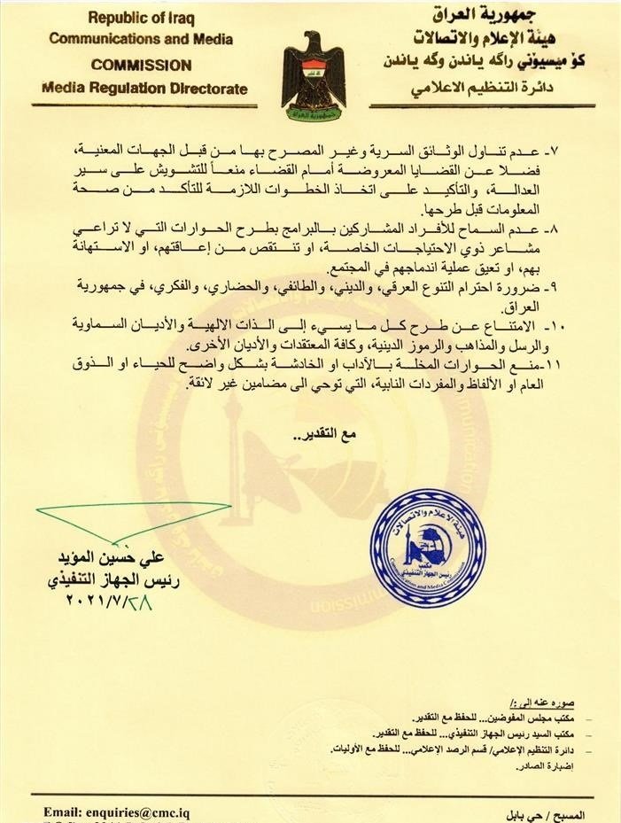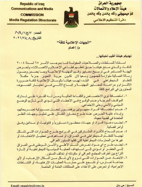 وقالت الهيئة في وثيقة صادرة عنها ، إنه "نهيب بوسائل الإعلام الالتزام ومراعات المعايير المهنية، ومنها استضافة ذوي الاختصاص والكفاءة العالية ومن له القدرة على تدارك المواقف الحرجة وعدم الوقوع في الأخطاء التي تؤدي إلى تأزيم الوضع السياسي والأمني وحتى الاجتماعي".وطالبت بتجنب دعوة أفراد أو جهات "محظورة دستوريا وقانونيا او مدانين وفق أوامر قضائية"، مشددة على "عدم السماح لضيوف البرامج بطرح الحوارات التي تشكل تهديدا للنظام الديمقراطي في العراق او تساهم في تعطيل الانتخابات".