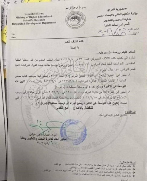 حسمت وزارة التعليم العالي والبحث العلمي، اليوم السبت، جدل التوسعة لمقاعد طلبة الدراسات العليا. وتضمنت وثيقة صادرة من وزارة التعليم، منع اجراء أي توسعة لمقاعد الدر اسات العليا مستقبلا.