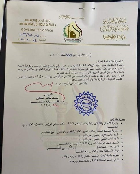 قرر محافظ كربلاء المقدسة نصيف جاسم الخطابي، اليوم السبت، إدارة بلدية المحافظة بنفسه.