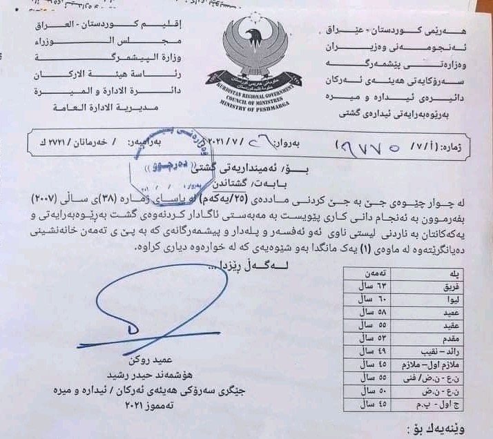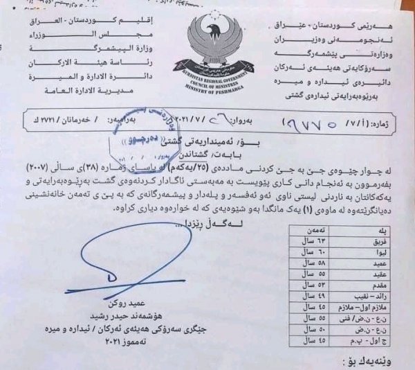 ووفقا لكتاب رسمي صادر عن الوزارة فإنه وجه مديريات ودوائر ووحدات البيشمركة بتنظيم اسماء المشمولين بالتقاعد. وأشار الكتاب إلى أن رتبة الفريق سيتم إحالته على التقاعد في سن 63 عاما، وكذلك اللواء البالغ من العمر 60 عاما إضافة إلى العميد البالغ من العمر 58 عاما، والعقيد البالغ من العمر 55 عاما، والمقدم في سن 53 عاما، رائد - نقيب 49 عاما، ملازم أول - ملازم 45 عاما، ن.ع، ن.ض فني 55 عاما، ن.ع، ن.ض 50 عاما، ج أول، ب.م 45 عاما.![]()