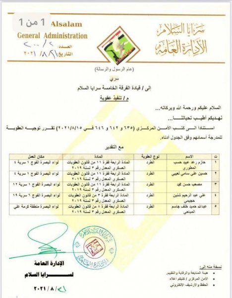 وجاء في الوثيقة : "استناداً الى كتاب الامن المركزي (635 و 646 في 2021/8/15) تقرر توجيه العقوبة للمدرجة أسمائهم وفق الجدول ادناه: