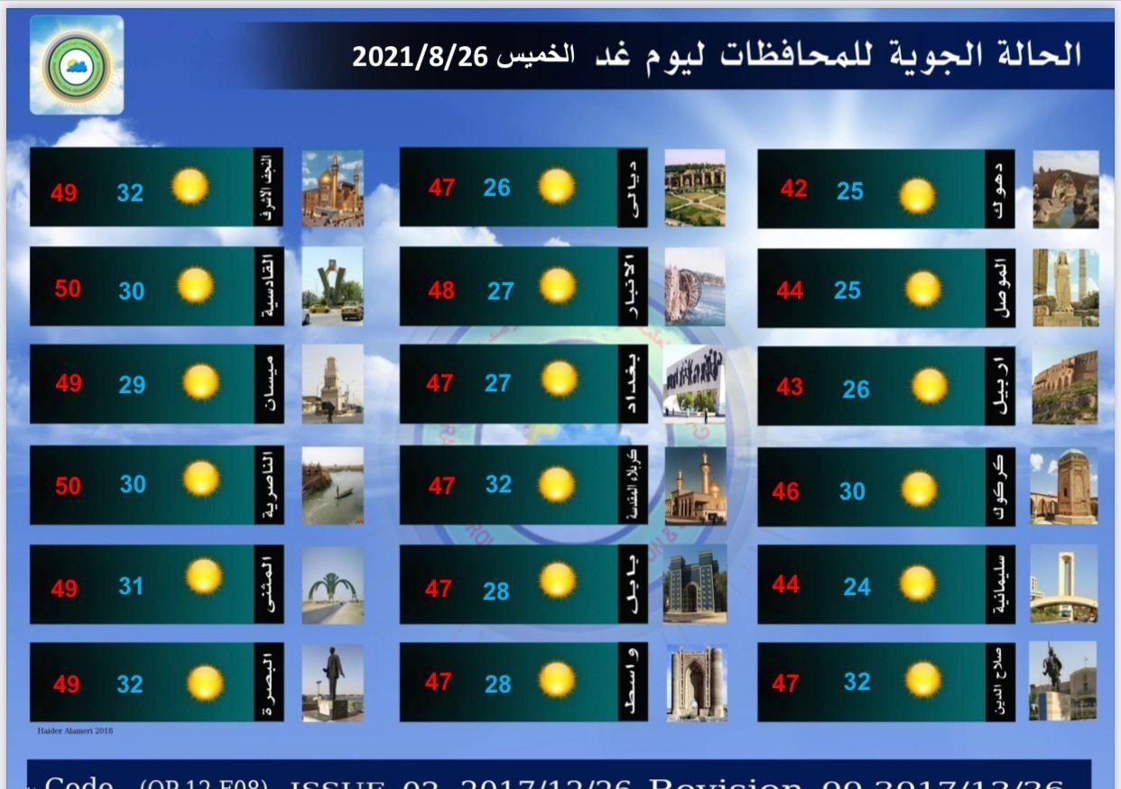 وذكر بيان للهيأة ، أن "الطقس ليوم غداً الخميس سيكون في المنطقة الشمالية صحو، ولا تغير في درجات الحرارة، والرياح شمالية غربية خفيفة الى معتدلة السرعة (10-20) کم/س، ومدى الرؤية (8-10) کم".وأضاف أن "طقس البلاد ليوم الجمعة سيكون في المنطقة الشمالية صحواً حار، ودرجات الحرارة ترتفع قليلا، والرياح شمالية غربية معتدلة السرعة (20-30) کم/س ، ومدى الرؤية (8-10) کم، أما في المنطقة الجنوبية والوسطى فسيكون الطقس صحواً حار، ولا تغير في درجات الحرارة، والرياح شمالية غربية معتدلة السرعة (20-30) کم/س مسببة تصاعد الغبار في بعض المناطق ،ومدى الرؤية (6-8) کم وفي بعض الاماكن (3-5)كم
