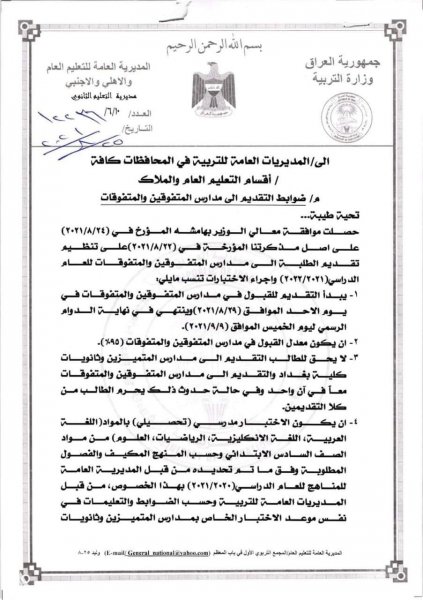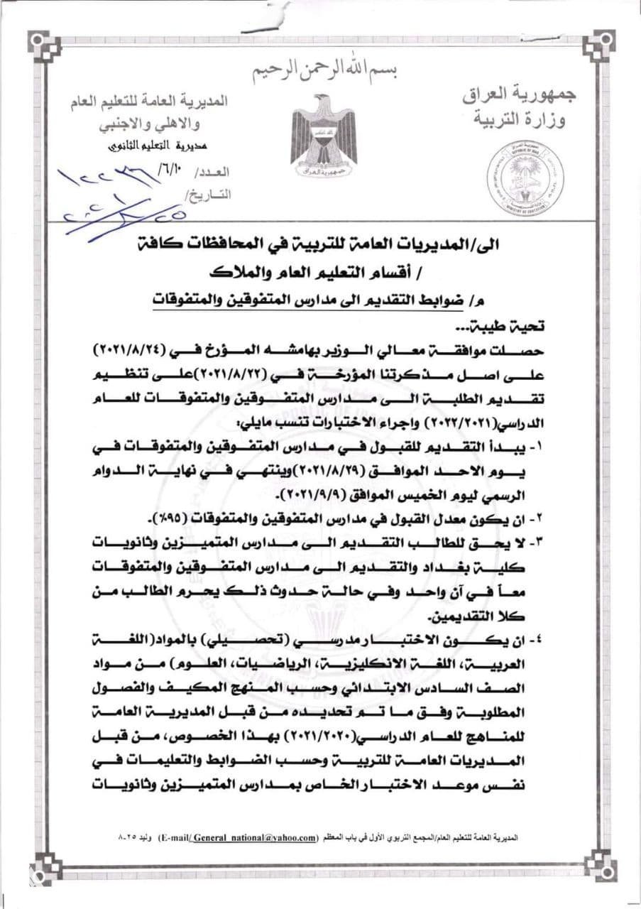 اصدرت وزارة التربية، اليوم الاربعاء، ضوابط التقديم الى مدارس المتفوقين والمتفوقات للعام الدراسي 2021 – 2022 .