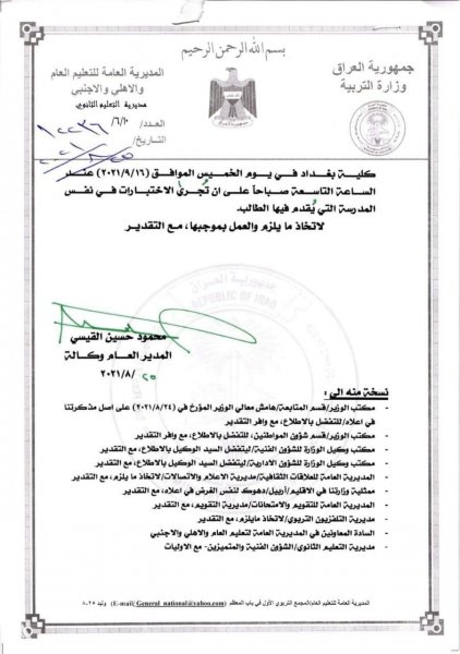 وذكرت الوزارة في بيان لها، ان "التقديم لمدار المتفوقين والمتفوقات يبدأ يوم الأحد الموافق 29 آب لعام 2021، وينتهي في نهاية الدوام الرسمي ليوم الخميس الـ9 من شهر أيلول المقبل"، مشيرا الى ان "ضوابط التقديم، تنص على قبول الطالب في مدارس المتفوقين والمتفوقات من الحاصلين على معدل (95%)".واضاف "لا يحق للطالب التقديم الى مدارس المتميزين وثانويات كلية بغداد، والتقديم الى مدارس المتفوقين والمتفوقات معاً في آن واحد"، مبينا انه "في حالة حدوث ذلك يحرم الطالب من كلا التقديمين".وتابع ان "الاختبار مدرسي (تحصيلي) بالمواد (اللغة العربية ، اللغة الإنكليزية ، الرياضيات ، العلوم) للصف السادس الابتدائي وحسب المنهج المكيف والفصول المطلوبة وفق ما تم تحديده من قبل المديرية العامة للمناهج للعام الدراسي (2020 – 2021) بهذا الخصوص".وبشأن موعد اختبار مدارس المتميزين وثانويات كلية بغداد، ذكر البيان ان "موعد الاختبار الخاص بمدارس المتميزين وثانويات كلية بغداد سيكون يوم الخميس الموافق (16 أيلول 2021) عند الساعة التاسعة صباحاً على ان تجري الاختبارات في نفس المدرسة التي يقدم فيها الطالب" .