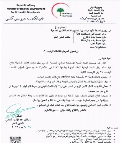 اصدرت وزارة الصحة العراقية، توضيحاً بشأن شمول الحوامل بلقاح كورونا.