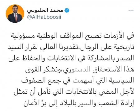 وقال الحلبوسي، في تغريدة على منصة تويتر: "في الأزمات تصبح المواقف الوطنية مسؤولية تاريخية على الرجال،تقديرنا العالي لقرار السيد الصدر بالمشاركة في الانتخابات والحفاظ على هذا الاستحقاق الدستوري".
