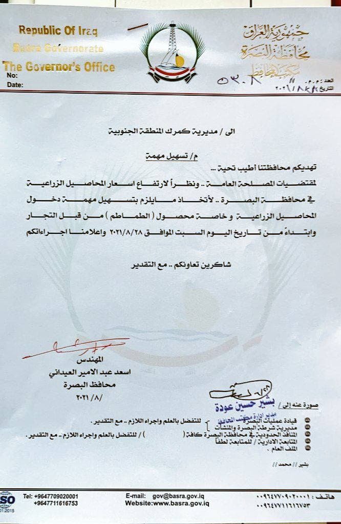 وجاء في الوثيقة التي تحمل توقيع العيداني، والموجهة إلى كمرك المنطقة الجنوبية، انه “نظر لارتفاع محاصيل الزراعية وجهنا بتسهيل ادخال المحاصيل الزراعية الى المحافظة وخاصة محصول الطماطم بسبب ارتفاع اسعارها الفاحش فيما كان هناك منع لدخولها ويتم ادخالها من كردستان”.