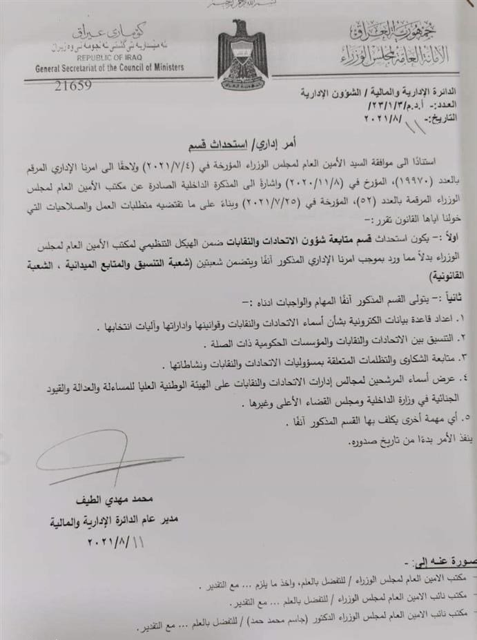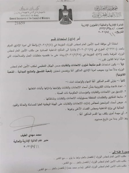 استحدثت الامانة العامة لمجلس الوزراء، اليوم الاثنين، قسما جديدا يعمل على بناء قاعدة بيانات إلكترونية بشأن اسماء النقابات والاتحادات وقوانينها وقوانين إدارتها وآلية انتخاباتها.