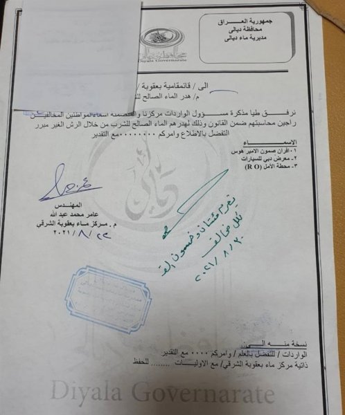 حصلت اليوم الأربعاء، على وثيقة حكومية صادرة عن دائرة ماء بعقوبة تعطي الضوء الاخضر بفرض غرامة مالية عن كل من يهدر الماء من خلال الرش غير المبرر للشوارع في ظل شح واضحة لمياه الشرب.