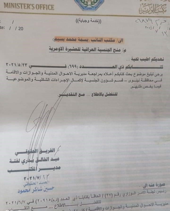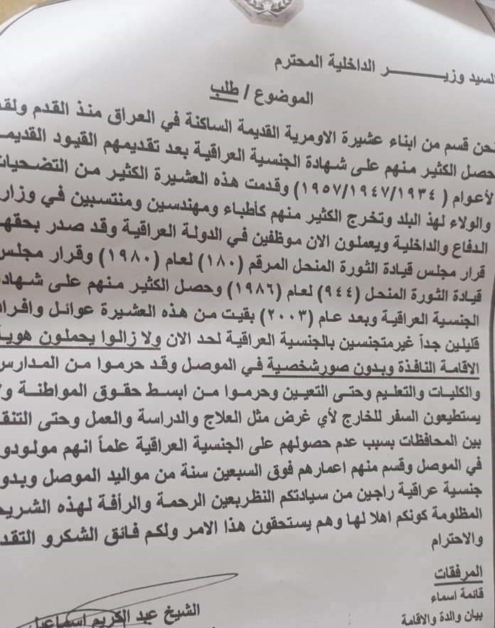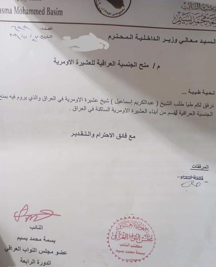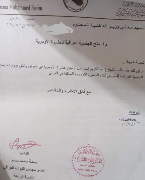اجابت وزارة الداخلية، اليوم الاثنين، على طلب منح الجنسية العراقية لعشيرة الاومرية.