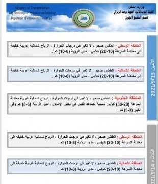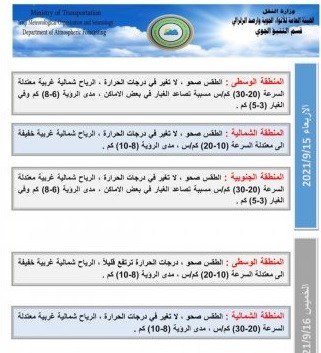أعلنت هيئة الأنواء الجوية، اليوم الأحد، عن حالة الطقس في العراق الأسبوع الحالي، فيما توقعت ارتفاعاً بدرجات الحرارة يوم الخميس المقبل.