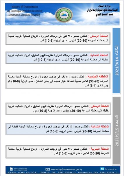 ونشرت الأنواء الجوية جداول توضح درجات الحرارة في المحافظات العراقية.
