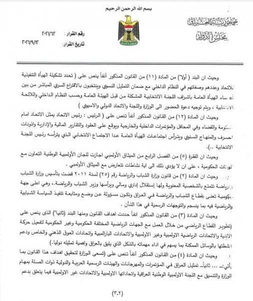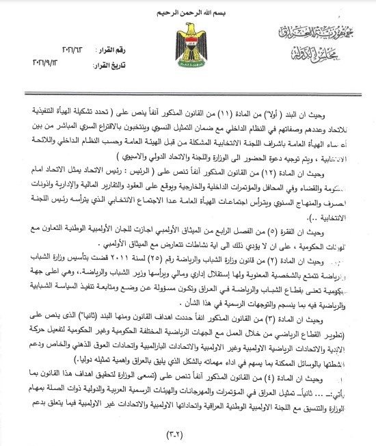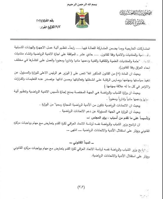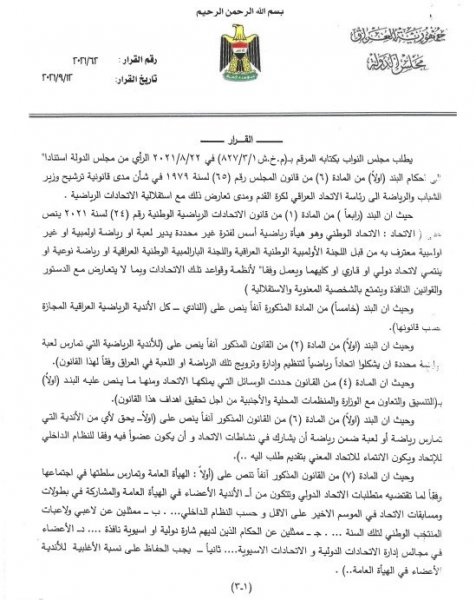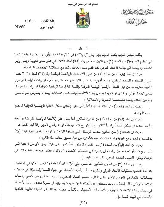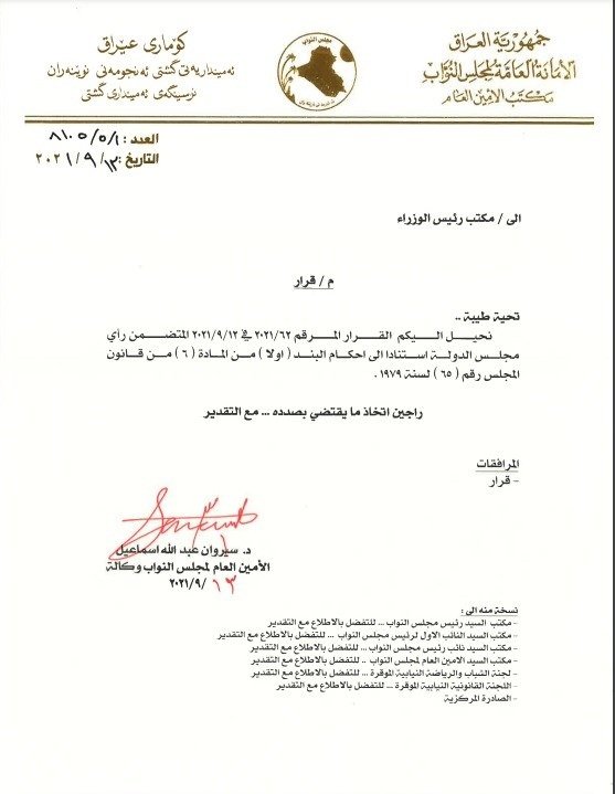 استفسرت الأمانة العامة لرئاسة مجلس النواب، من مكتب رئيس الوزراء مصطفى الكاظمي، عن مدى قانونية ترشيح وزير الرياضة والشباب عدنان درجال لانتخابات رئاسة الاتحاد العراقي لكرة القدم .