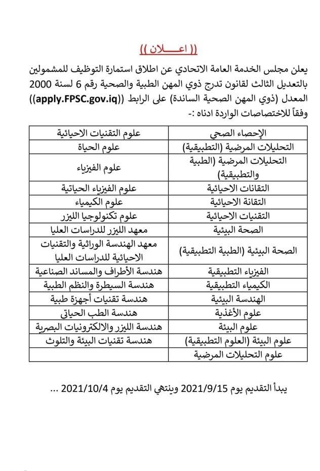 اعلن مجلس الخدمة العامة الاتحادي عن اطلاق استمارة التوظيف للمشمولين بالتعديل الثالث لقانون تدرج ذوي المهن الطبية والصحية رقم ٦ لسنة ٢٠٠٠ المعدل ( ذوي المهن الصحية الساندة) .